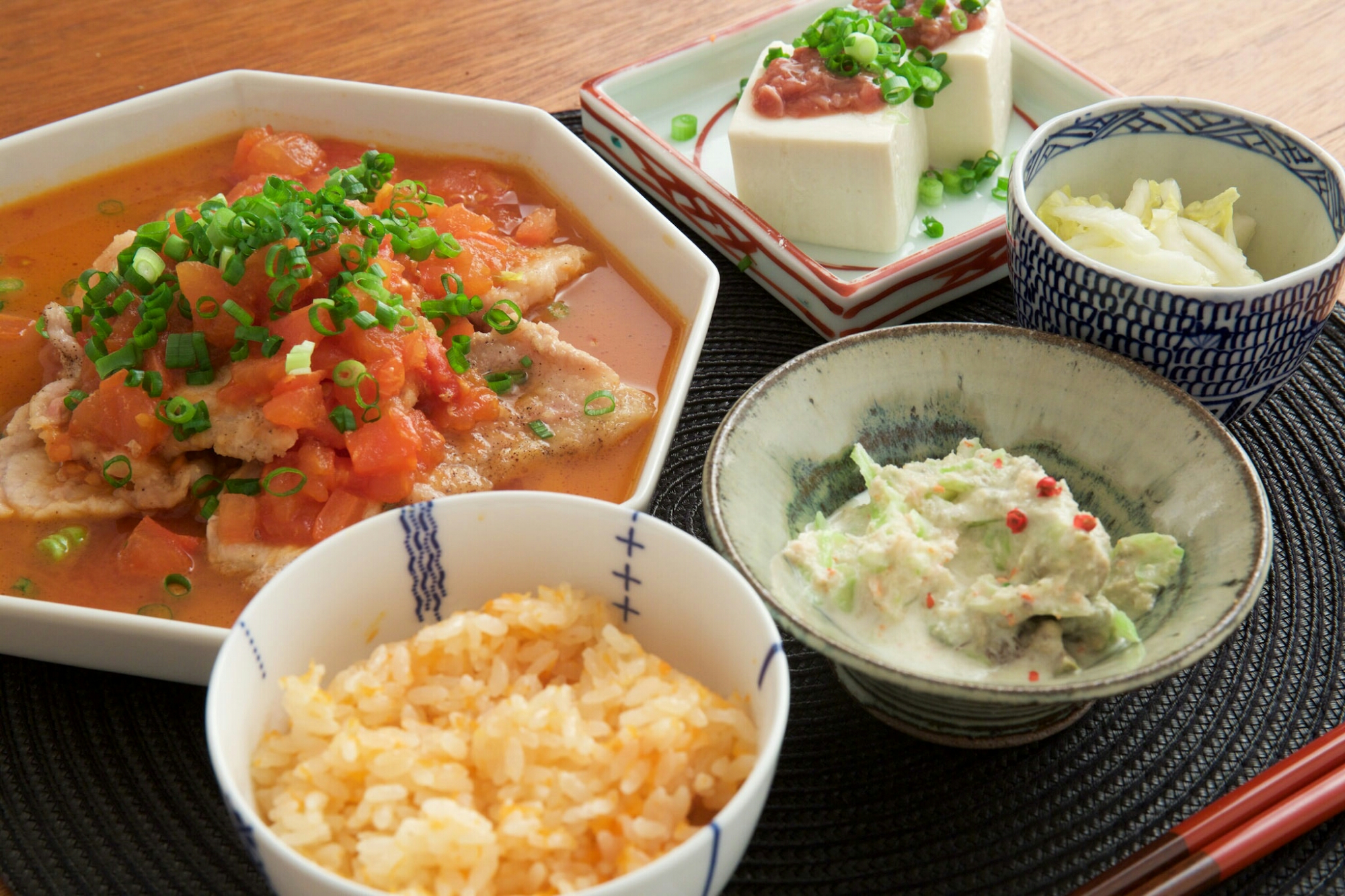 フレッシュトマトソースのポークソテー 酒盗奴 白菜の柚子胡椒浅漬け セロリとアボカドの蟹サラダ にんじんごはん